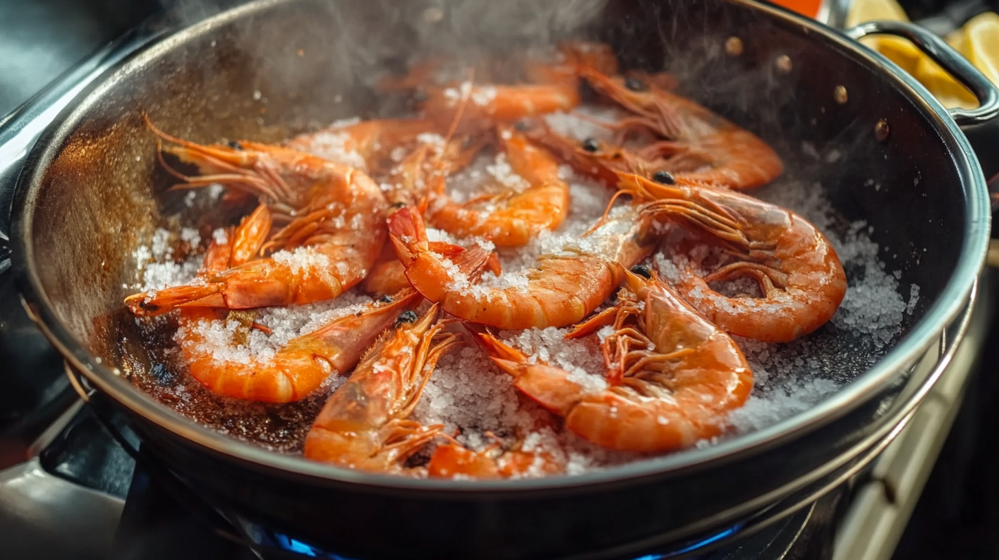 후라이팬이나 냄비에 호일을 깔고 소금을 얇게 펴고 대하를 올린다.