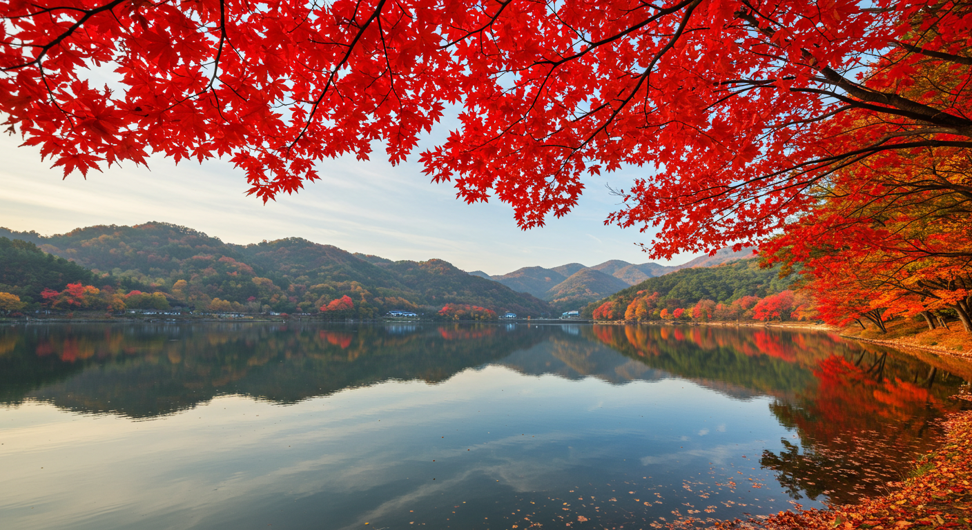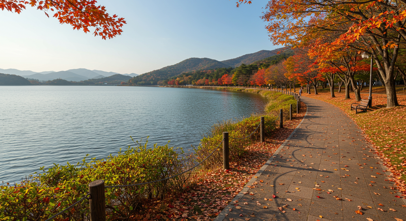 청평호반은 호수와 단풍이 어우러져 가을 드라이브 명소로 손꼽혀요. 붉은 단풍이 호수에 반사된 풍경은 환상적이고, 주변에는 뷰 좋은 카페와 레스토랑이 많아 데이트 코스로도 좋아요.