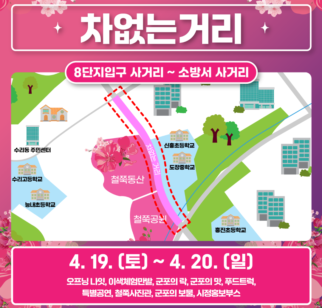 축제 장소는 크게 세 곳이에요. 철쭉꽃의 압도적인 규모를 자랑하는 철쭉동산이 메인이고요, 바로 옆 철쭉공원에서도 다양한 행사나 휴식을 즐길 수 있어요. 그리고 축제 기간 중에는 차 없는 거리가 운영되어 좀 더 편하게 돌아다니거나 특별한 프로그램들을 만날 수도 있습니다. 이 세 곳이 모두 가까이 붙어 있어서 걸어 다니며 구경하기 좋아요. 군포시와 군포문화재단에서 열심히 준비한다고 하니 기대해 봐도 좋겠죠?