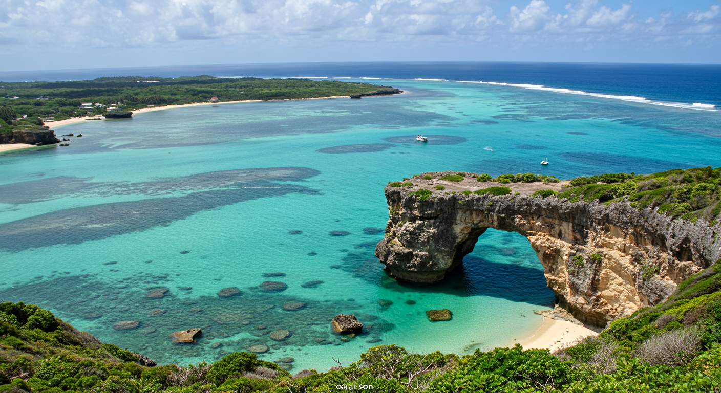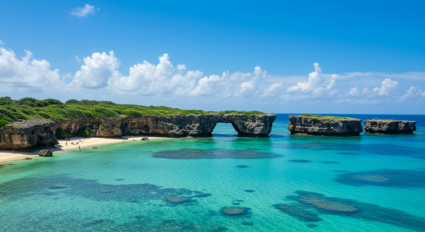 - 오후: 미야코지마 본섬으로 돌아와 스나야마 해변의 상징적인 아치 바위와 해변 풍경 감상. 이케마 대교를 건너 이케마섬 잠시 방문 및 이케마 블루 감상.