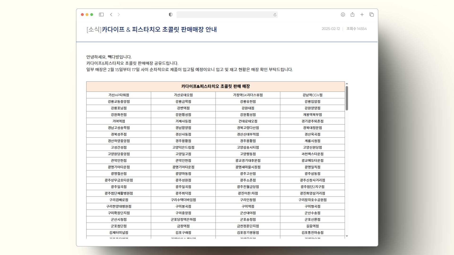 빽다방 두바이 초콜릿은 전국의 다양한 매장에서 구매할 수 있습니다. 특히 카다이프와 피스타치오 초콜릿은 일부 매장에서 2025년 2월 15일부터 17일 사이에 순차적으로 입고될 예정입니다. 주요 판매매장은 다음과 같습니다.