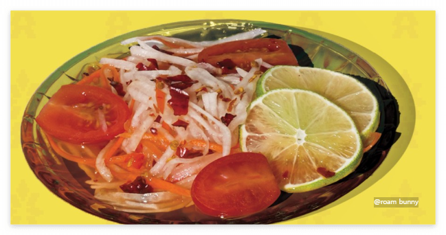 마지막으로 '싸멍쏨땀'! 그린파파야로 만든 특제 라임소스에 버무린 새콤달콤한 샐러드예요. 입맛을 돋우는 데 제격이죠.