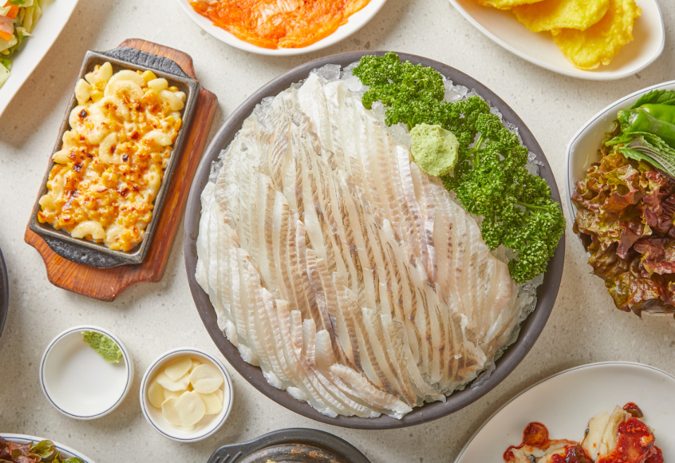 싱싱한 해산물이 가득 들어간 시원하고 감칠맛 넘치는 물회로, 무더운 날씨에 딱이에요. - 도다리회 (중: 84,000원)