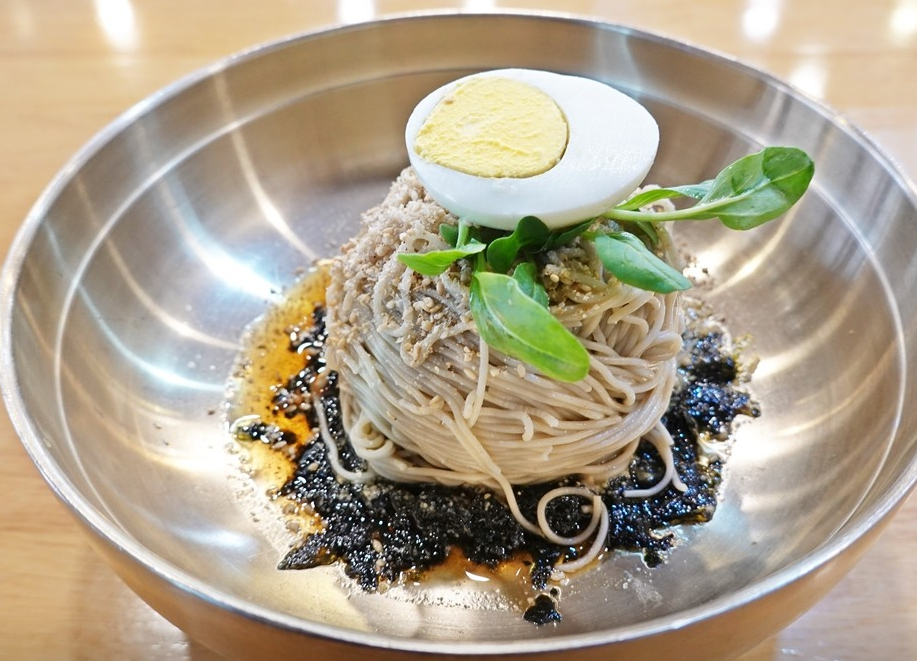 직접 짠 들기름과 김가루가 어우러져 고소한 풍미가 일품이에요. 메밀면의 탄력과 담백함이 돋보이는 메뉴예요. - 물메밀막국수 (11,000원)