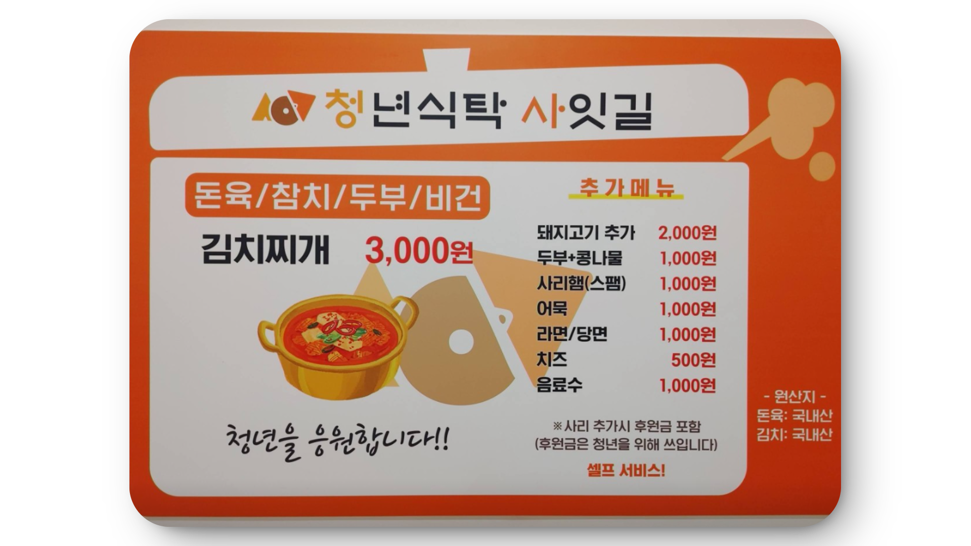 청년식탁사잇길의 특별한 점 중 하나는 저렴한 가격에 맛있는 김치찌개를 제공한다는 점입니다. 청년들이 경제적인 부담 없이 든든하게 식사를 할 수 있도록 다양한 메뉴가 준비되어 있습니다.
