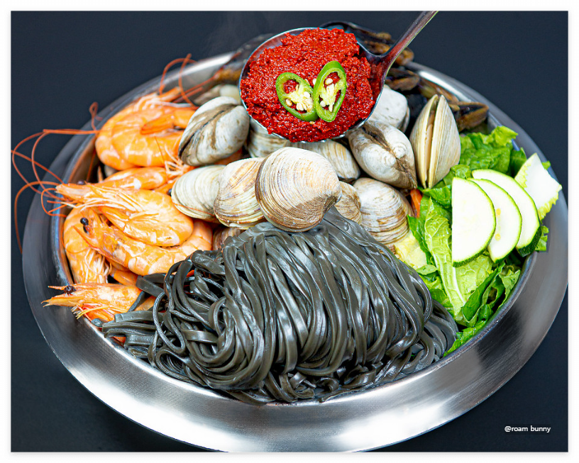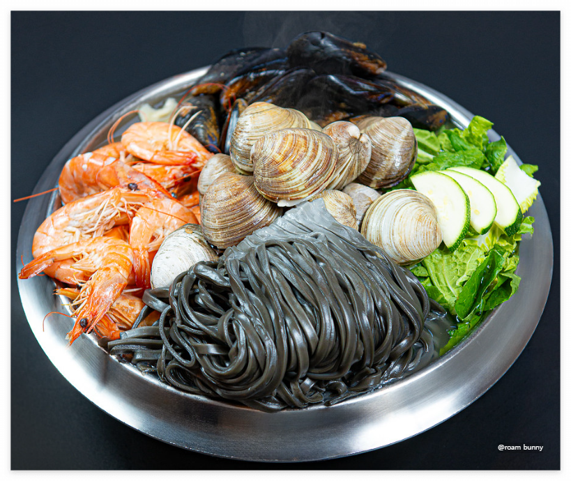 방파제칼제비의 또 다른 특별함은 바로 오징어 먹물을 사용한 면입니다. 검은색 면발이 처음엔 낯설 수 있지만, 한 번 맛보면 그 독특한 풍미에 반하게 됩니다. 오징어 먹물은 단순히 색깔만 내는 게 아니라 면의 쫄깃함을 더해줍니다.