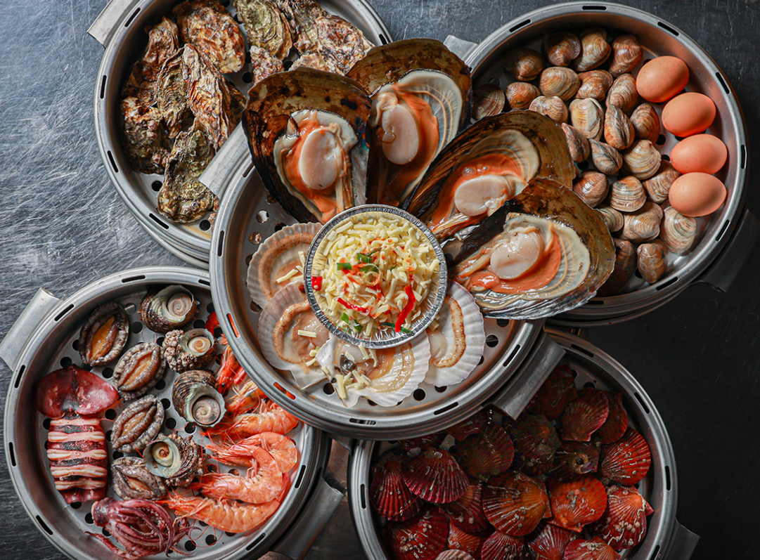 특별 메뉴로는 황제조개찜이 있어요. 3단, 4단, 5단 구성으로 제공되며 통오징어, 키조개, 가리비, 홍가리비, 새우, 석화, 계란, 소라까지 한 번에 담겨 나와요. 모임이나 특별한 식사 자리에서 선택하기 좋은 메뉴에요.