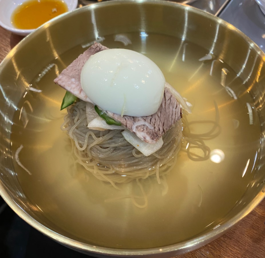 직접 뽑은 메밀면을 슴슴한 차가운 소고기 육수에 말아, 담백하면서도 깔끔한 맛을 제공합니다.