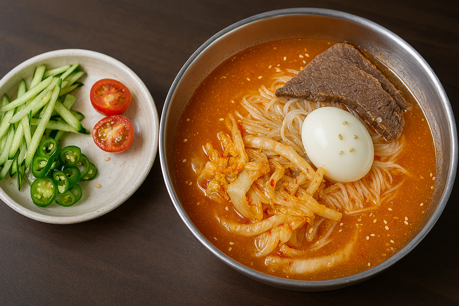 - 김치말이국수: 여름철 시원한 메뉴로 덤벙김치와 시원한 물육수로 말아먹는 김치말이국수