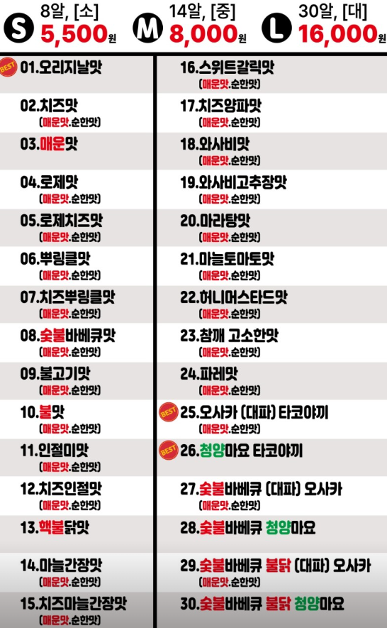 라라타코야끼는 메뉴의 선택 폭이 넓고 가격도 합리적입니다. 주요 메뉴와 가격은 아래와 같습니다