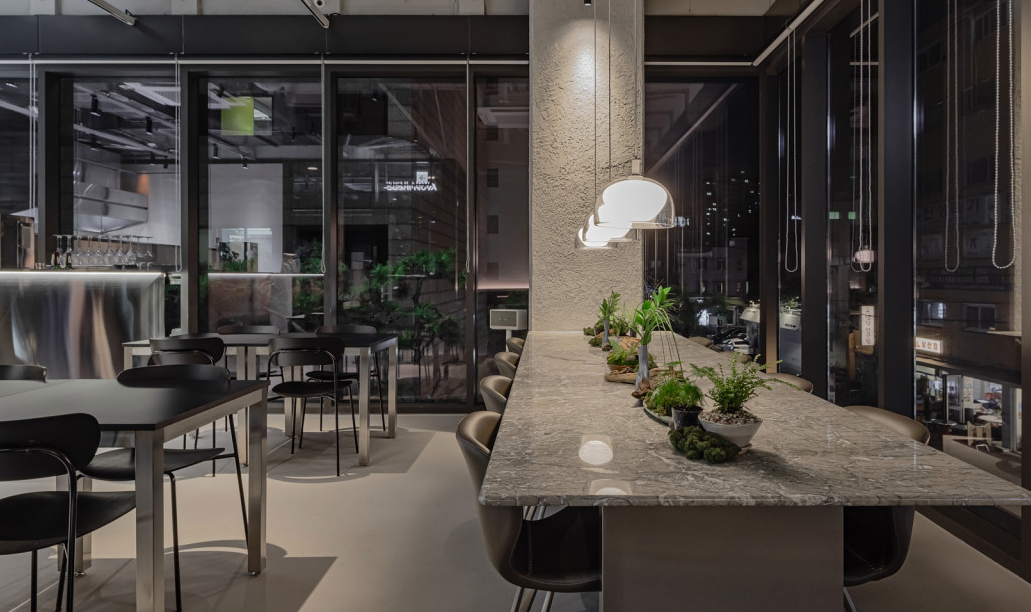 매장 내부로 들어서면 블랙과 스틸 소재가 어우러진 세련되고 모던한 인테리어가 시선을 사로잡아요. 따뜻한 조명이 더해진 공간은 데이트나 소개팅 장소로 손색없을 만큼 아늑한 무드를 자아내요. 넓은 통창 너머로 펼쳐지는 도시의 풍경을 바라보며 식사할 수 있어 시각적인 즐거움까지 더해졌어요. 오픈 키친 구조를 통해 셰프들이 요리하는 생생한 모습을 직접 볼 수 있어 신뢰감이 생기고, 2인석부터 단체석까지 마련되어 있어 어떤 모임이든 편안하게 이용할 수 있어요.