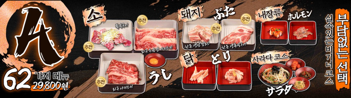 - 다양한 메뉴 구성 및 코스 선택 가능: A코스부터 사이드 무제한 코스 등 다양한 코스가 준비돼 있어요. 가격은 29,800원부터 시작해 부담 없이 즐길 수 있어요.
