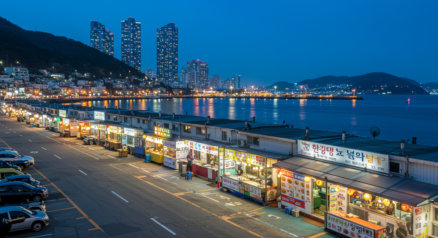 영도포차촌은 부산 항구의 저녁 풍경 속 다양한 포장마차가 줄지어 늘어서 있어요. 해가 지면 하나둘씩 불을 밝히고, 저마다의 자리에서 손님을 맞이해요. 낮에는 항구 앞 주차장으로 사용되다가 밤이면 포장마차촌으로 변신하는 모습도 특별해요. 부산 특유의 바닷바람과 항구의 불빛이 어우러져 낭만적이고 활기찬 분위기를 연출해요. 현지 노포 감성을 그대로 간직하고 있어 오랜 세월 부산을 지켜온 시장의 따뜻함도 느껴진답니다.