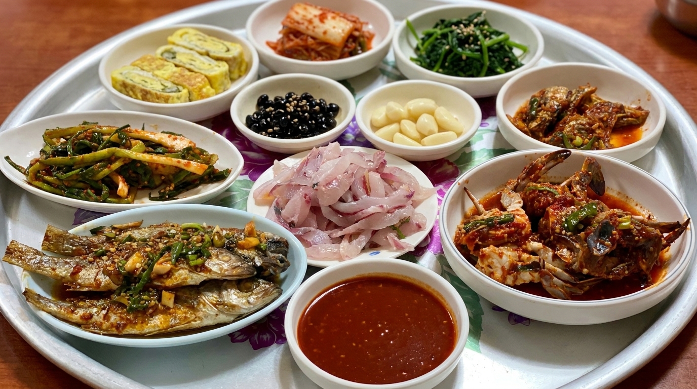 메인 메뉴인 회뿐만 아니라 함께 나오는 밑반찬들의 퀄리티도 상당해요! 직접 무친 싱싱한 나물부터 밥도둑 양념게장, 금방 부쳐낸 따뜻한 달걀부침, 그리고 깊은 맛의 된장국까지 총 10가지가 넘는 반찬이 상을 가득 채워요. 하나하나 할머니의 손길이 닿지 않은 곳이 없어 집밥의 정석을 보여줘요.