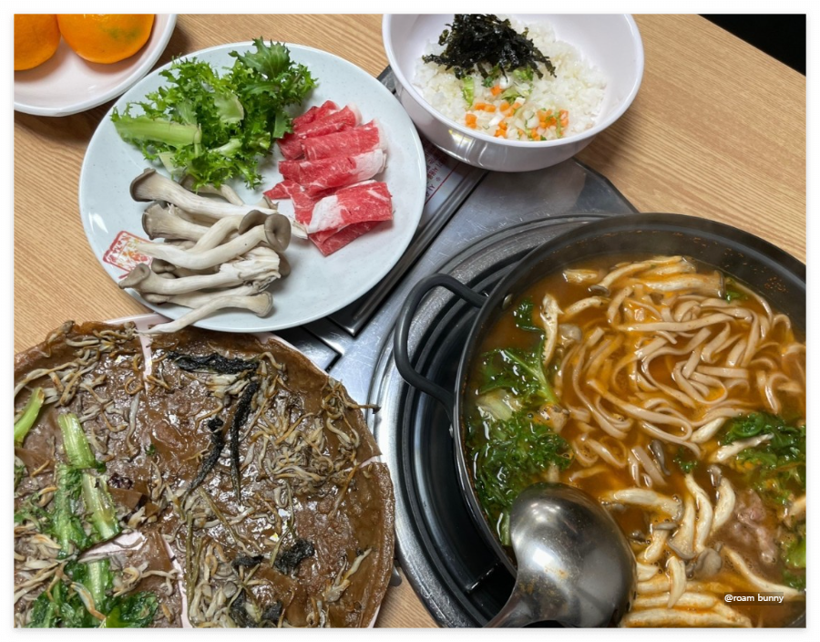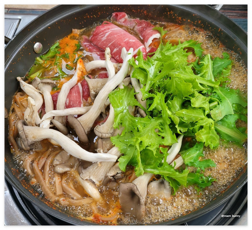 면발도 특별하지만, 육수 역시 남다르답니다. 오가피나무, 엄나무 등 5가지 나무를 넣어 끓인 육수에 한 달 동안 숙성시킨 장을 더해요. 이렇게 만들어진 샤부칼국수는 건강함이 물씬 느껴지는 한 그릇이 되는 거예요. 소고기와 버섯, 만두까지 더해져 푸짐함은 말할 것도 없고요.