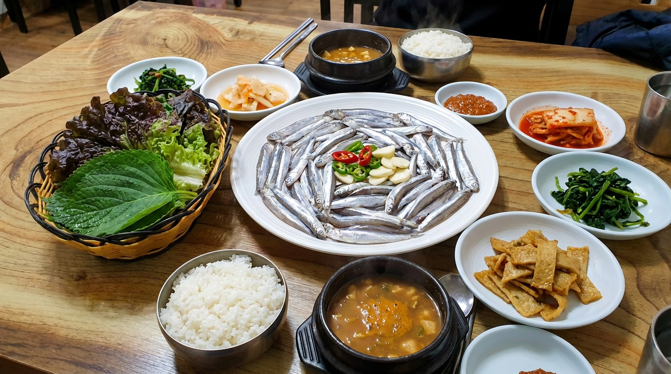 멸치쌈밥과 쌍벽을 이루는 인기 메뉴는 바로 새콤달콤한 양념이 돋보이는 멸치회무침이에요. 당일 공수한 신선한 멸치만을 선별하여 손질하기 때문에 입안에서 살살 녹는 부드러운 식감을 느낄 수 있어요. 신선한 채소와 할머니표 비법 양념이 어우러진 회무침은 잃어버린 입맛을 돋우기에 충분하며, 밥에 슥슥 비벼 먹어도 별미예요. 멸치 특유의 고소함이 양념과 만나 감칠맛이 극대화되어 자꾸만 손이 가게 만드는 중독성을 가지고 있어요.