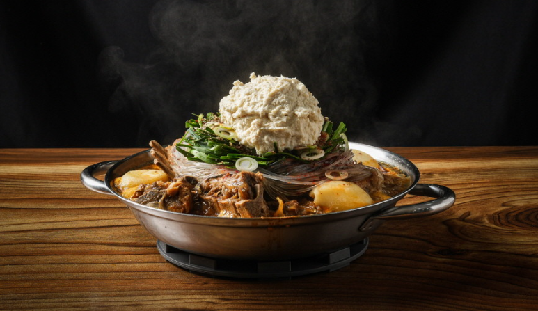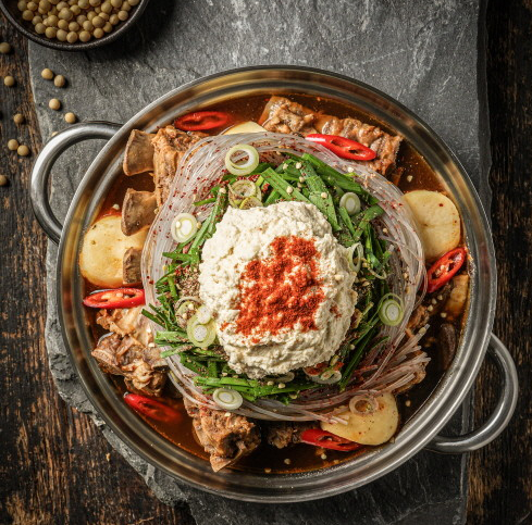 '초당콩 감자탕'은 콩과 감자탕의 조화가 주는 특별함이 돋보이는 메뉴입니다. 다른 감자탕과는 달리, 강원도 정선에서 재배한 국내산 콩으로 만든 콩비지가 듬뿍 올라가 있어 부드러우면서도 고소한 맛을 자랑합니다. 여기에 돼지고기 등뼈가 어우러져 깊은 육수 맛을 느낄 수 있으며, 맷돌 두유기로 갈아낸 콩의 원재료 맛이 그대로 살아있습니다. 초당콩의 풍미는 기존의 감자탕과 차별화되는 매력을 선사합니다.