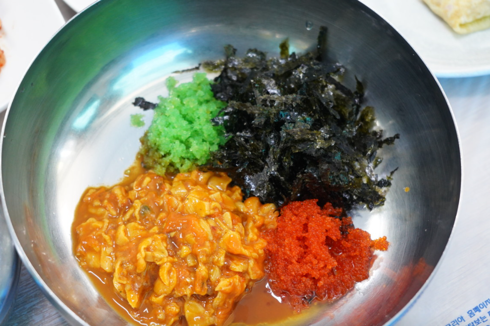 성게비빔밥 또한 인기 메뉴인데요. 부드럽고 고소한 성게와 함께 열기구이가 기본으로 세팅되어 나오며, 상큼한 미나리 무침까지 곁들여져 특유의 풍미가 배가되는 메뉴에요. 비빔밥을 한입 먹으면 싱그러운 바다의 맛과 향기를 그대로 느낄 수 있답니다.