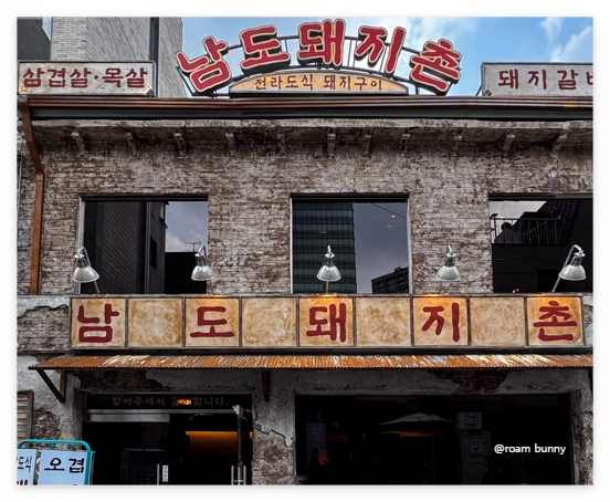 남도돼지촌은 용산구 한강대로40가길 40에 위치해 있으며, 퇴근 후 피곤한 몸을 달래줄 완벽한 장소입니다. 겉모습부터 독특한 레트로 감성을 자아내며, 안으로 들어서면 마치 옛날 시골집에 온 것 같은 아늑한 기분을 느끼게 합니다. 입구부터 주위 손님들로 인해 문전성시를 이룹니다.