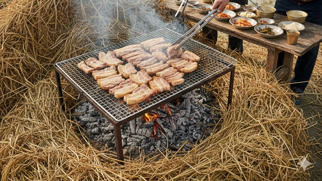 이 집의 가장 큰 특징은 주문과 동시에 시작되는 강렬한 짚불 퍼포먼스에 있어요! 무안의 비옥한 토양에서 자란 벼를 수확해 3년 이상 정성껏 말린 볏짚만을 사용하는 고집이 맛의 첫 번째 비결이에요. 잘 마른 볏짚은 순간 화력이 어마어마해서 고기에 순식간에 진한 향을 입혀줘요.