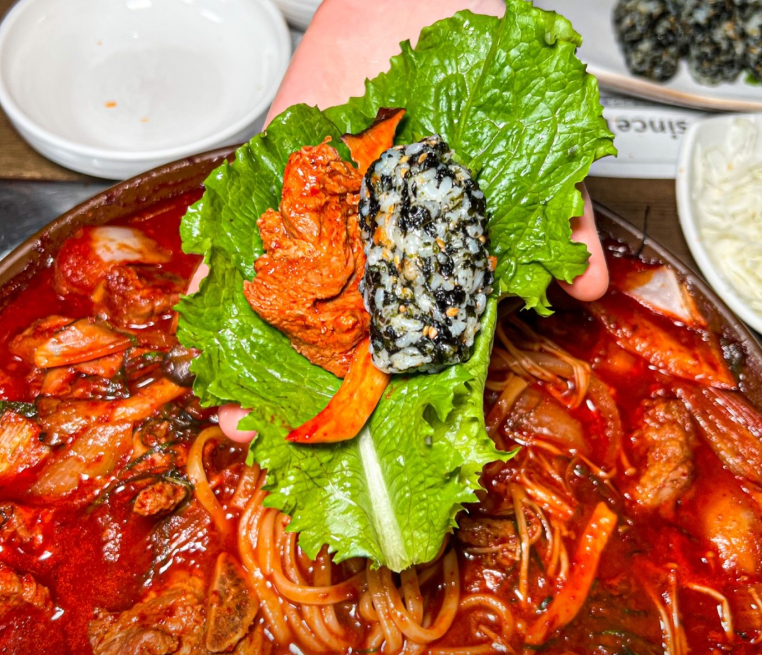 시원한 맛의 동치미국, 신선한 쌈채소, 그리고 쫄깃한 우동사리가 기본으로 제공되어 메인 메뉴와 함께 식사의 완성도를 높입니다. - 겨울 한정 얼큰갈비찌개