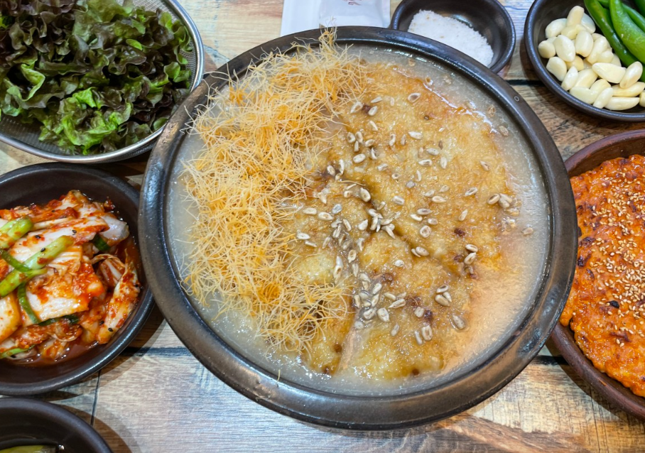 명궁약수가든의 대표 메뉴는 단연 누룽지 닭백숙이에요. 이 백숙은 일반적인 방식이 아니라, 철분과 탄산이 풍부한 약수로 조리해 깊은 맛을 더했어요. 압력솥에 닭 다리를 넣고 찹쌀, 녹두, 대추, 마늘을 함께 끓여내는데, 약 18분간 누룽지가 고소하게 눌어붙도록 정성껏 익히는 것이 특징이에요. 이 과정에서 완성된 국물은 깊고 진하며, 닭고기는 부드럽고 담백해요. 누룽지는 바삭하면서도 고소해 백숙과 함께 먹으면 배부르고 든든하게 즐길 수 있답니다.