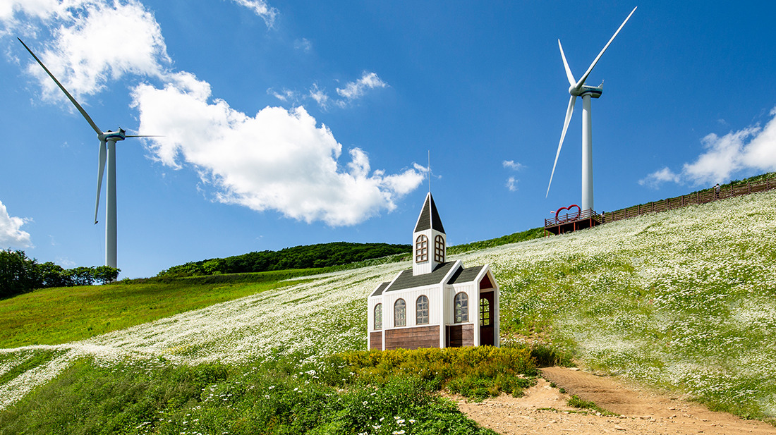 이곳의 또 다른 매력은 바로 풍력발전기와 꽃밭이 어우러진 풍경이에요. 웅장한 풍차가 돌아가는 모습을 배경으로 하얀 꽃들이 바람에 흔들리는 모습은 정말 장관입니다. 자연과 사람의 기술이 조화를 이룬 특별한 풍경을 볼 수 있어 더욱 매력적이에요.