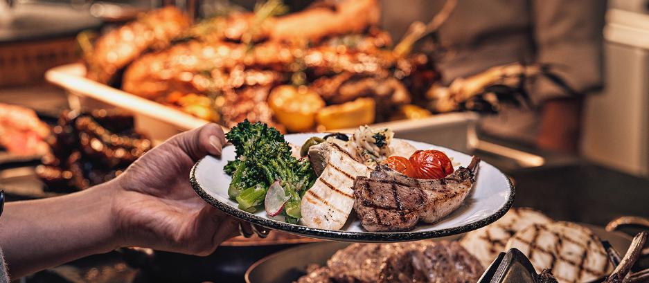 저녁 뷔페는 고급 해산물 요리와 스테이크, 수입 치즈, 고급 디저트까지 한 자리에서 즐길 수 있어요.
