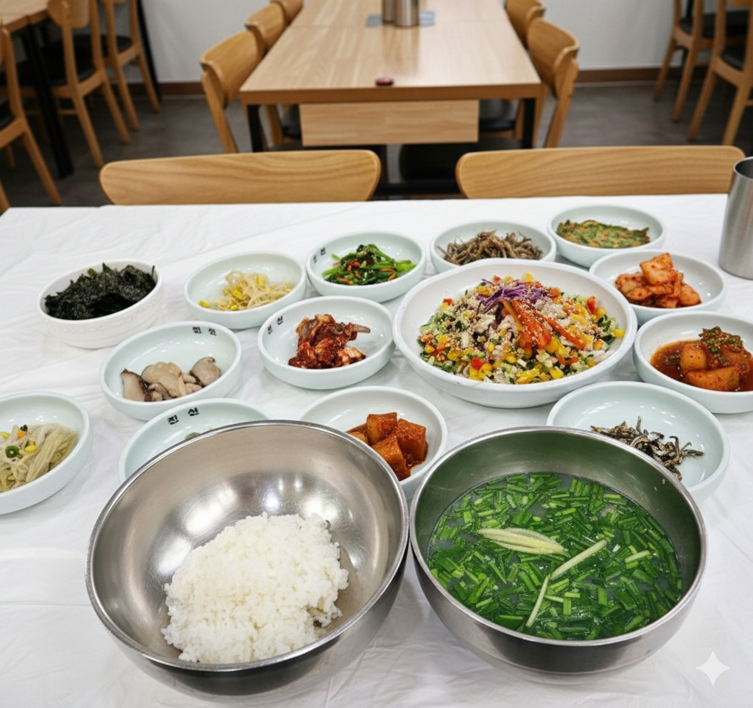재첩 정식을 주문하면 섬진강의 넉넉한 인심을 느낄 수 있는 12가지 이상의 반찬이 함께 나와요. 정갈하게 차려진 신선한 나물과 밑반찬들은 재첩국의 시원한 맛을 더욱 돋보이게 해줘요. 뽀얗게 우러난 재첩국물은 한 입 마시는 순간 속이 확 풀리는 개운함을 선사하며, 알알이 씹히는 재첩 살의 식감이 무척 즐거워요.