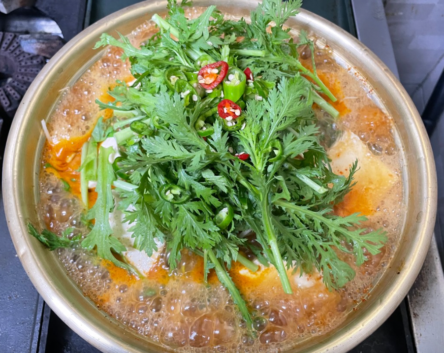 동태탕의 핵심은 바로 국물이에요. 이곳은 재료 본연의 맛을 살린 담백한 국물이 특징인데, 미나리 향이 시원하게 배어 있어 한 숟가락 먹는 순간 향이 먼저 올라와요.국물은 텁텁하지 않고 깔끔하게 떨어져서 밥과 함께 먹어도 느끼함이 없어요. 동태의 비린 맛이 거의 나지 않고, 시원함과 깔끔함이 강조된 스타일이라 남녀노소 모두 좋아하기 좋은 국물 맛이에요.