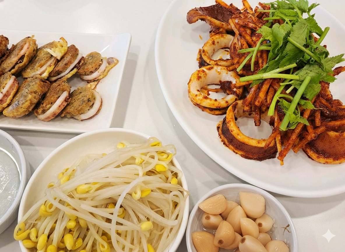 대표 메뉴인 오징어보쌈과 함께 반드시 곁들여야 할 메뉴는 바로 가성비 최고의 섞어찌개와 고소한 오징어순대에요. 6,000원이라는 합리적인 가격의 섞어찌개는 보글보글 끓여내어 매운맛을 중화시켜주는 시원한 국물 맛을 지니고 있어 보쌈과의 궁합이 아주 훌륭해요. 또한 속이 꽉 찬 오징어순대는 담백하면서도 짭짤한 풍미가 가득해 아이들이나 매운 음식을 잘 못 드시는 분들에게도 인기가 높은 별미랍니다. 기본으로 제공되는 뜨끈한 미역국과 콩나물, 상추, 김 등의 쌈 재료를 활용하면 매운맛을 조절하면서도 더욱 풍성하고 다채로운 식사를 완성할 수 있어 방문객들의 만족도가 매우 높아요.