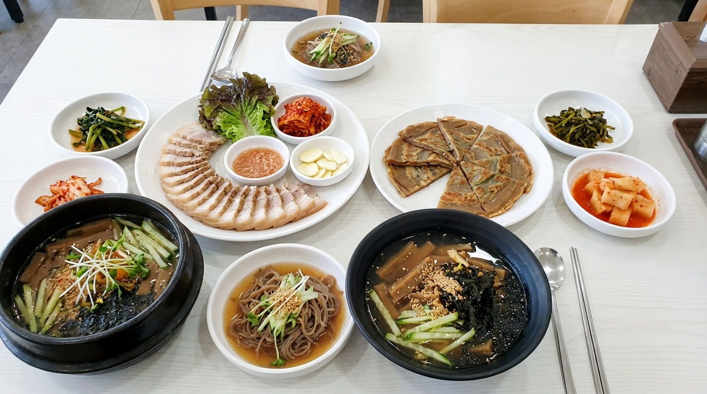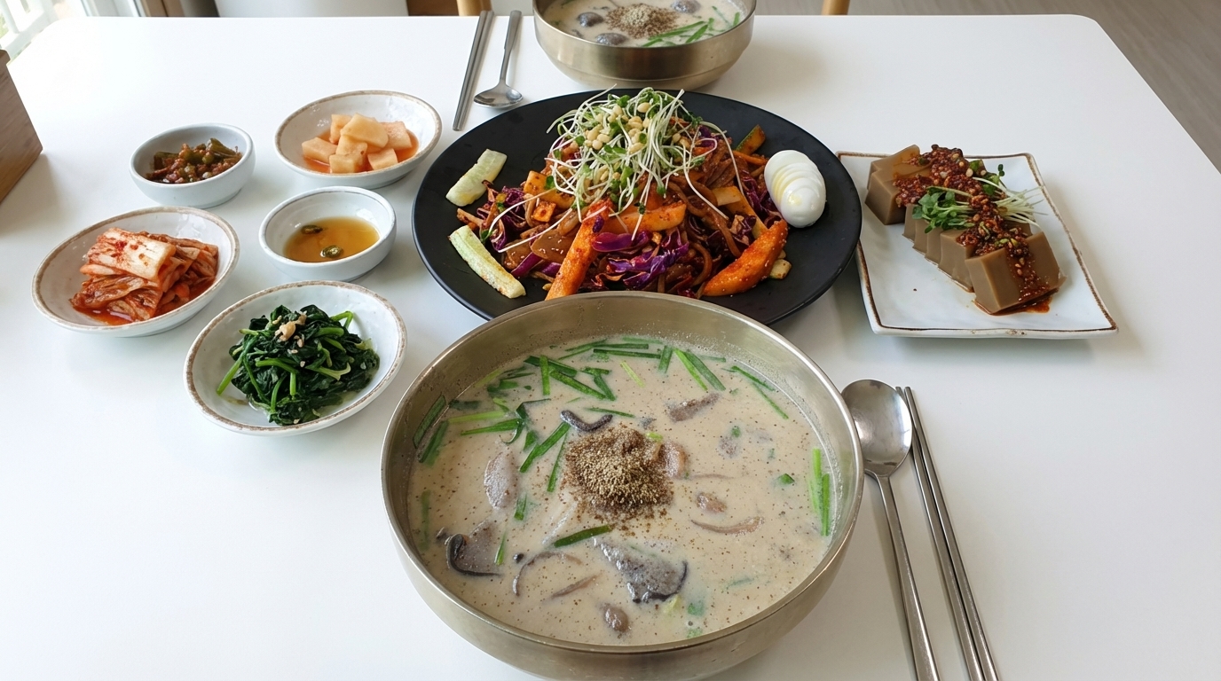 새싹무침에 들어가는 채소들은 산지에서 직송한 듯 싱싱함이 살아있어 아삭함이 남달라요. 고소한 들기름 향이 코끝을 자극하며 도토리 고유의 떫은맛을 잘 잡아내어 자꾸만 손이 가게 만드는 중독성이 있어요. 쟁반국수의 양념이 조금 강하다고 느껴질 때쯤 담백한 새싹무침이나 간장무침(16,000원)을 한 입 먹어주면 입안이 깔끔하게 정리되는 느낌을 받을 수 있어요. 전현무계획3 방송에서도 이 환상적인 조합에 출연진들이 감탄을 금치 못했답니다.