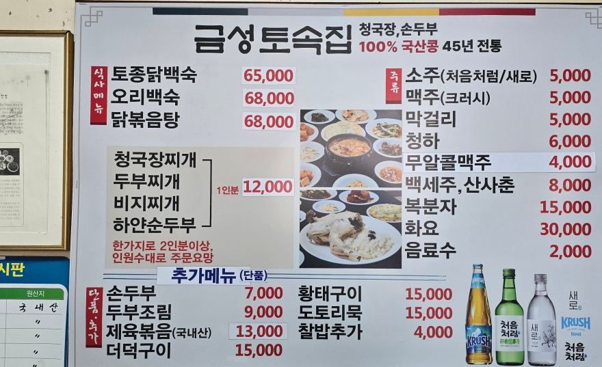 메뉴판을 보면 든든한 보양식부터 가벼운 식사류까지 골고루 준비되어 있어요. 가장 인기가 많은 청국장찌개는 1인분에 12,000원으로 푸짐한 밑반찬과 함께 제공되어 가성비가 훌륭해요. 여럿이 방문한다면 토종닭 한마리(65,000원)나 오리 한마리(68,000원)를 곁들여 더욱 풍성하게 즐길 수 있어요. 닭볶음탕(68,000원)은 매콤달콤한 양념이 잘 배어 있어 술안주나 가족 외식 메뉴로도 손색이 없답니다.