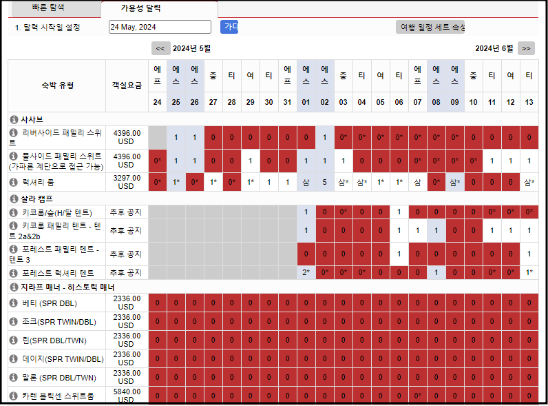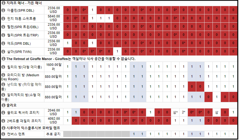 케냐 기린호텔 가격은 2336 ~ 5840 USD 까지 확인할 수 있습니다. 한국금액으로 458만원 ~ 1146만원까지 상당합니다. 객식예약은 아래 링크를 통해서 예약이 가능합니다. 하지만 빨간색 표시로 되어 있는 부분은 0이라고 적혀 있는데 예약이 꽉찼다는 내용이네요 과연 예약이 가능한건지 (?) 궁굼해지기 까지 합니다.