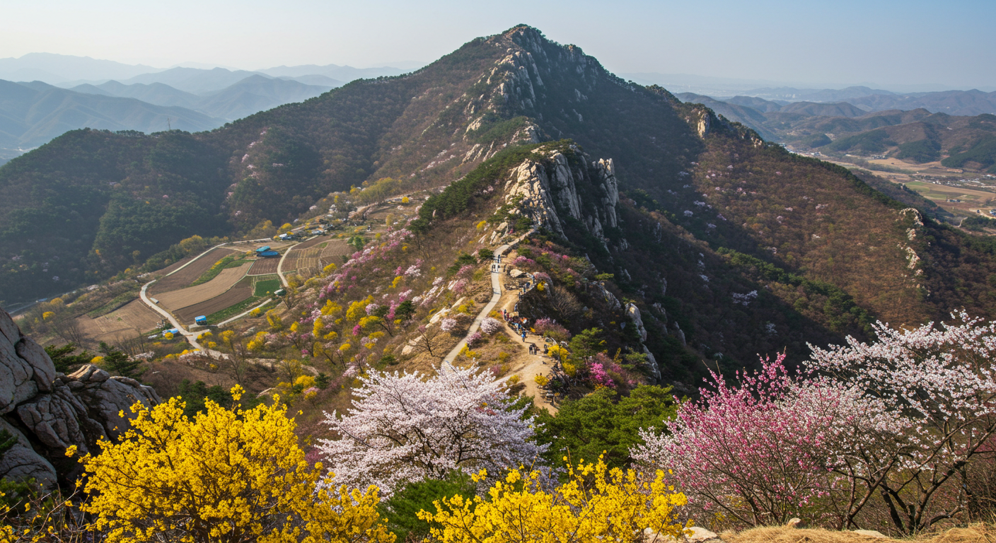 - 특징: '달이 머무는 봉우리'라는 이름처럼 아름다운 월류봉의 절경과 어우러진 봄 풍경을 감상할 수 있는 곳이에요. 월류봉 자체를 등반하지 않더라도, 월류봉 광장이나 주변 도로에서 봉우리를 배경으로 피어난 벚꽃이나 복사꽃 등을 감상할 수 있죠. 특히 월류봉 아래를 흐르는 초강천과 정자(월류정)가 어우러진 풍경은 한 폭의 동양화 같답니다. 드라이브 삼아 들러보세요.