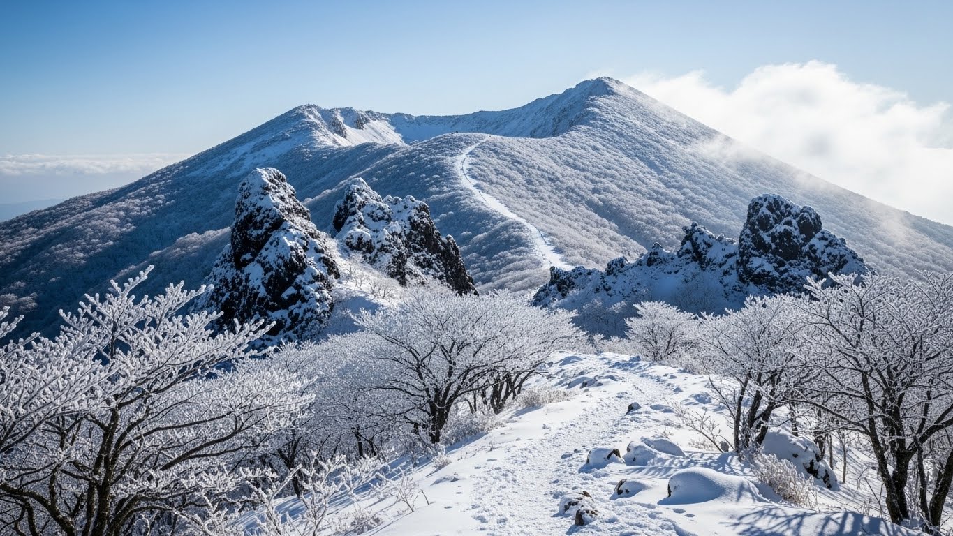 한라산 국립공원은 겨울이면 ‘설산’이라는 표현이 잘 어울릴 만큼 장관을 이루는 곳이에요. 성판악, 관음사, 영실, 어리목 등 다양한 난이도의 탐방로가 마련되어 있어 본인의 체력이나 일정에 맞춰 선택할 수 있어요.12월 한라산의 매력은 맑은 제주 하늘 아래 펼쳐지는 설경이에요. 때로는 바람이 강하지만 풍경이 너무 아름다워서 걸으며 감탄하게 되는 순간이 많아요.특히 정상 부근에서 만나는 일출은 많은 사람들이 겨울에 찾는 이유 중 하나였어요. 바람은 차갑지만 장갑과 방풍 재킷만 챙기면 충분히 즐길 수 있어요.