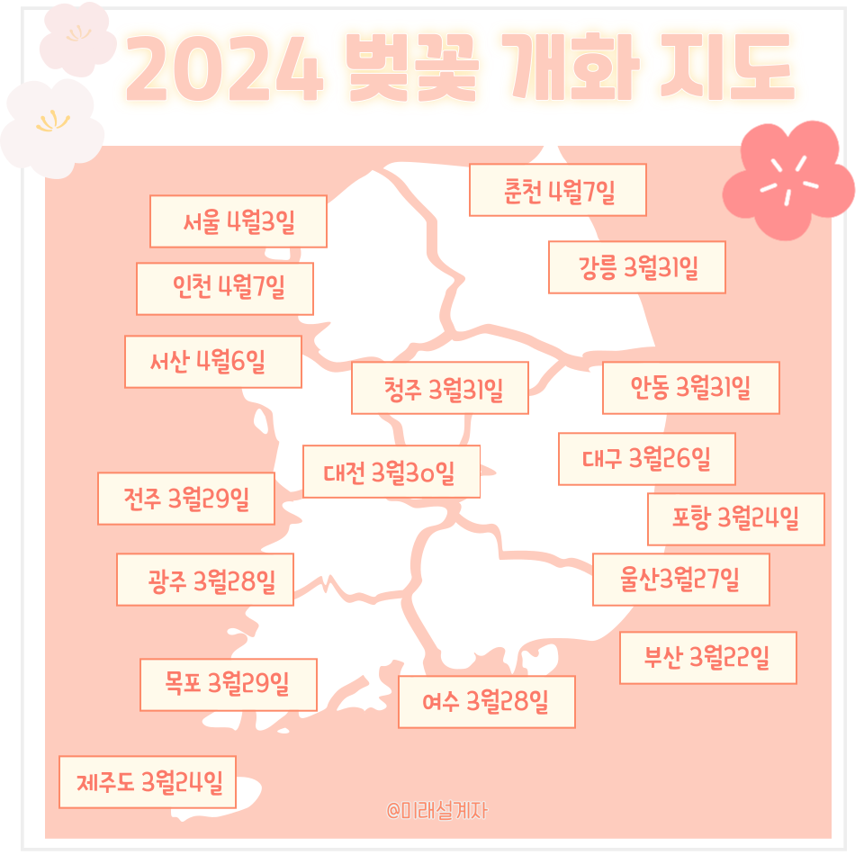 수도권지역 보다는 경상도와 제주도 지역이 가장 먼저 피기 때문에 여행을 계획해 보는 것도 좋을 것 같습니다. 전국을 여행하기 좋은 봄을 준비하기 위한 2024 벚꽃개화시기와 벚꽃축제 벚꽃명소까지 알아봤습니다. 자료를 참고하시어 아름다운 벚꽃을 만끽하시고 늦게 않게 서둘러 봄과 멋진 추억을 남기시기를 추천드립니다.