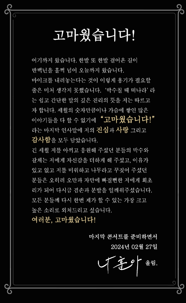 트로트의 전설 나훈아 선생님의 콘서트가 마지막이 될 것 같습니다. 벌써 반백년이 지났다고 표현하시는 나훈아 선생님 자필편지로 저희에게 깊은 인사말을 써주셨습니다. 그의 마지막 콘서트 정말 놓쳐서는 안 되겠죠 선생님의 마지막 콘서트 일정과 공연정보를 포스팅해보겠습니다. 서둘러 티켓을 꼭 구매하시어 마지막까지 함께 하시길 추천드립니다.