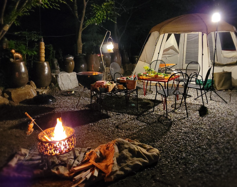 - 특징: 바비큐 및 불멍 텐트 내부에 냉장고 및 빔프로젝터 비치되어 있어서 편하게 사용 가능