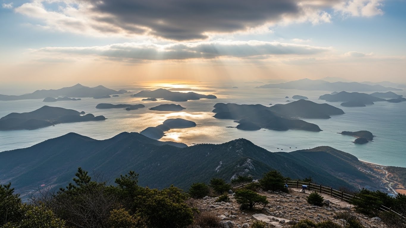 통영 미륵산은 케이블카를 이용해 비교적 편안하게 정상에 오를 수 있어 남녀노소 모두에게 인기가 많아요. 정상에 서면 한려수도의 보석 같은 섬들이 발아래로 펼쳐지는데, 섬과 섬 사이를 뚫고 올라오는 태양의 빛줄기는 그야말로 장관이에요. 다도해의 잔잔한 물결 위로 붉은 카펫이 깔리는 듯한 모습은 통영에서만 느낄 수 있는 독보적인 미학을 자랑해요.
