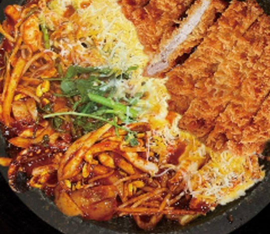 오징어볶음에 치즈와 돈가스를 조합한 메뉴로, 특히 돈가스와 어우러진 소스의 맛이 인상적이에요. - 옛날치킨