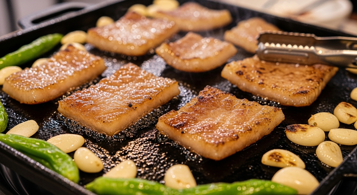 돼지껍데기는 얇지 않고 도톰한 스타일로 조리되어 있어요. 겉면은 불향이 나고 안쪽은 쫀득한 식감이 있어 연탄불과 잘 어울리는 조합이에요. 가격은 7,000원으로 다양한 구성에 적합한 메뉴예요. 전체적으로 고기 굽는 과정에서 기름이 빠지면서 깔끔하게 완성돼요.