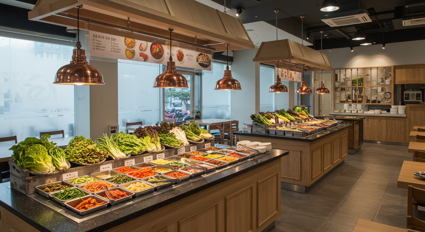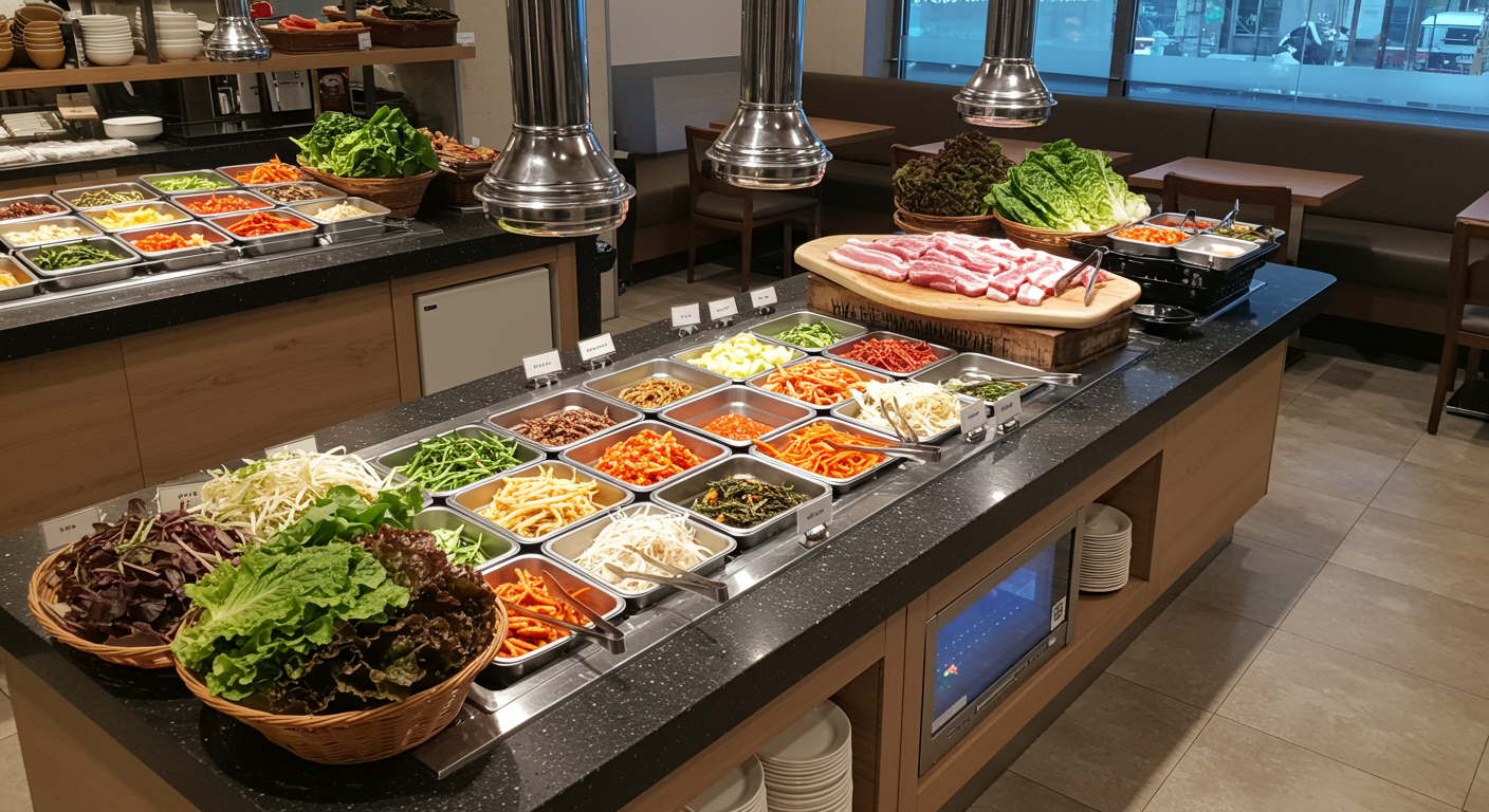 이 집의 또 다른 매력 포인트는 바로 '셀프바'입니다. 고기 먹을 때 꼭 필요한 신선한 상추, 깻잎, 마늘, 고추, 쌈장, 김치 등 다양한 쌈 채소와 곁들임 반찬들을 눈치 보지 않고 원하는 만큼 가져다 먹을 수 있도록 준비해 두었어요. 고기 먹다 보면 채소나 마늘 리필하기 조금 미안할 때도 있는데, 여기서는 그럴 필요가 전혀 없죠. 내가 먹고 싶은 만큼, 좋아하는 종류로 골라서 편하게 가져다 먹으면 되니 얼마나 좋은지 몰라요. 오히려 직원분들을 계속 부르지 않아도 되니 식사의 흐름이 끊기지 않고, 가게 입장에서도 일손을 더는 효과가 있어 이런 착한 가격 유지에 도움이 되는 시스템인 것 같습니다. 편리함과 가성비, 두 마리 토끼를 다 잡은 셈이죠.