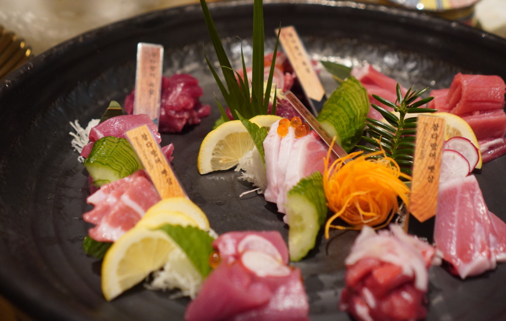 참치회, 참치 모둠 스시, 후또마끼, 묵은지 참치 등뼈찜, 수제 치즈 함박, 모둠튀김, 샐러드, 미소시루, 쯔께모노 5종, 김과 소스 2종