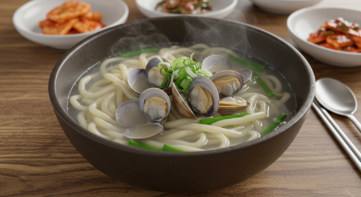 고추장 베이스의 얼큰한 국물이 시원하고 자극적이지 않게 만들어져 중독성 있는 맛을 자랑해요. - 물총조개 칼국수: 8,000원