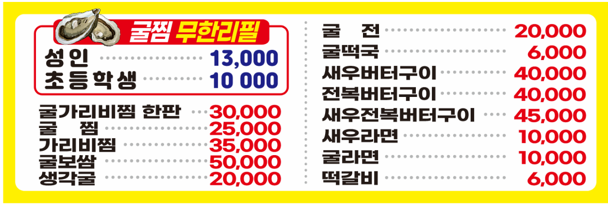 - 가격 정보: 굴찜 무한 리필 성인 13,000원 / 초등학생 10,000원