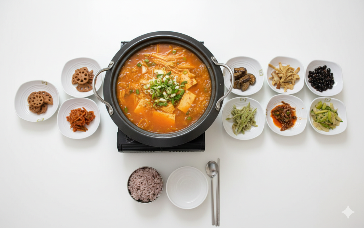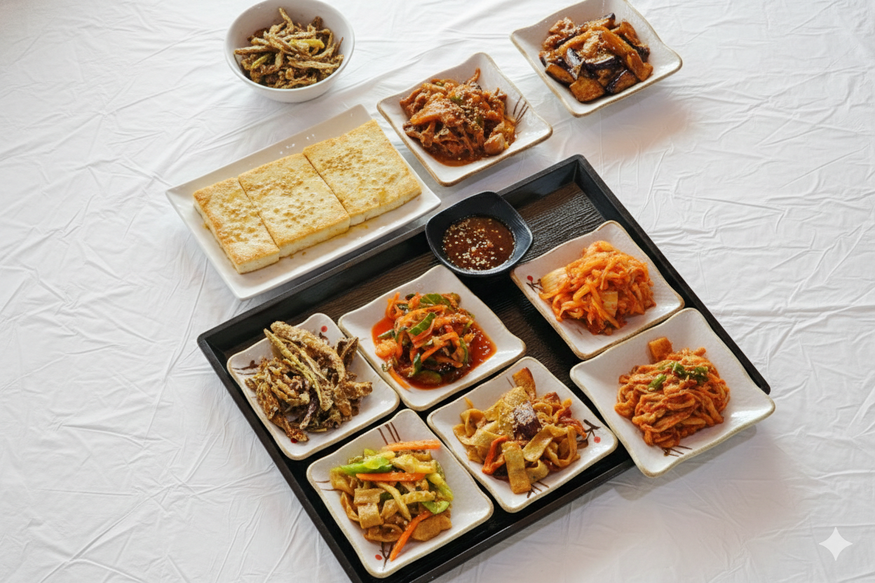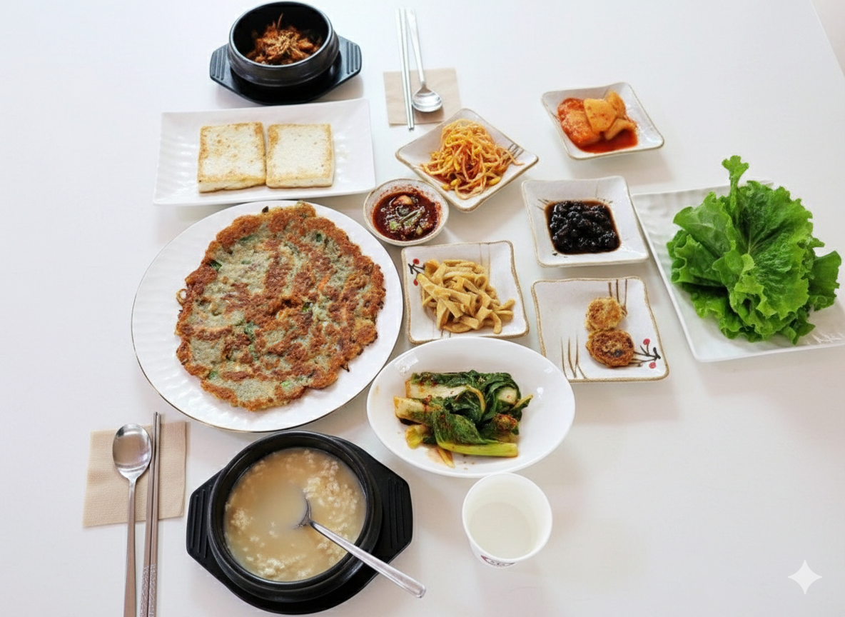 - 제육쌈 순두부와 정갈한 반찬들