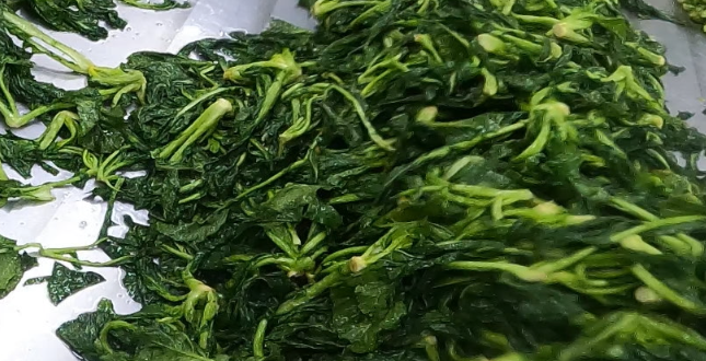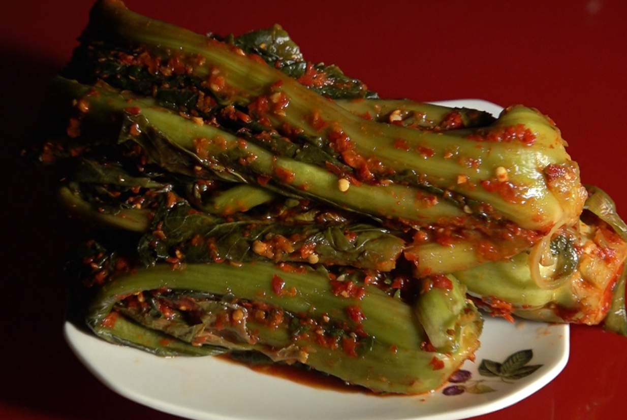 갓김치를 만들기 위해 하루 약 1톤가량의 갓을 수확합니다. 이 갓은 바로 공장으로 옮겨져 깨끗이 세척한 뒤 적절히 절이는 과정을 거칩니다. 절임 과정에서는 갓이 뜨지 않도록 누름 판으로 눌러주며, 약 10시간 동안 절이는 과정을 거칩니다. - 양념 준비