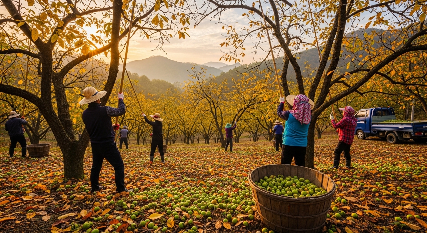 전라북도 정읍시 산외면의 장군봉농원은 매년 가을이 되면 호두 수확으로 분주해요. 하루 목표량은 무려 1.5톤이에요!작업자들은 새벽부터 밭에 나가 대나무 장대를 들고 나무를 두드리며 호두를 떨어뜨려요. 하지만 나무를 상하게 하면 내년 수확량에 영향을 주기 때문에 섬세한 기술이 필요하대요.