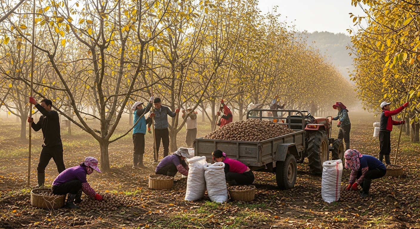 수확된 호두는 바로 먹을 수 있는 게 아니에요! 먼저 초록빛 청피(껍질)를 벗겨내야 해요. 이 과정은 하루 종일 손이 멈출 틈이 없어요.청피가 벗겨진 호두는 깨끗이 세척된 후 약 5일간의 자연 건조 과정을 거쳐요. 그때서야 우리가 흔히 보는 ‘갈색 호두 껍질’ 형태가 되죠.하지만 여기서 끝이 아니에요! 속껍질이 워낙 단단해서 기계로 깨면 내용물이 부서질 위험이 커요. 그래서 대부분의 호두는 수작업으로 직접 손으로 까야 한답니다.한 알 한 알 정성껏 깬 호두가 식탁 위 고소한 간식이 되는 거예요.